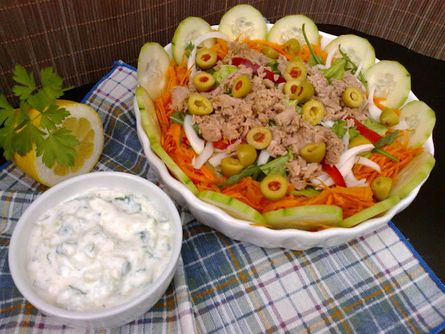 ingredients in a deep dish, being careful to finish with the tuna. Serve with tzatziki sauce or