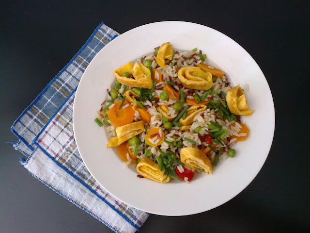 Sendo assim, uma das minhas vontades é voltar a ter a "meat free monday" aqui no blogue como incentivo para uma alimentação mais cuidada. E hoje começo a semana com uma receita simples mas que adoro e faço algumas vezes. Pode ser feita de raíz ou feita para aproveitar arroz cozido de sobra, seja como for, fica uma delícia e bem saudável. Espero que gostem ...
