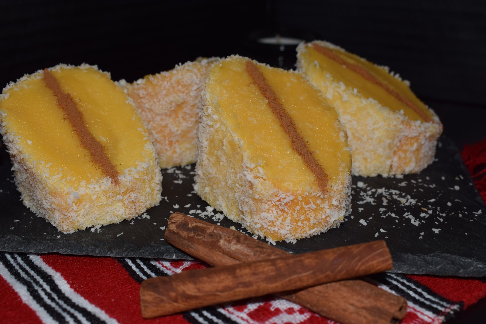 Corte as pontas da torta. Divida a torta em 5 partes iguais, depois dê um corte na diagonal em cada uma das partes de forma a obter 10 partes inclinadas. Barre a superfície inclinada e as laterais com o doce de ovos, polvilhe depois as laterais com coco ralado e faça um risco de canela em pó na superfície (como mostram as fotos). Sirva à temperatura ambiente ou frescas (eu prefiro bem fresquinhas).